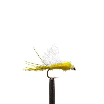 Yellow Emerger (Sizes 16–18): A lightly dressed pattern with a yellow body and CDC wing. Imitates a freshly emerged PMD caught in the surface film. Best fished in slower currents or slicks.