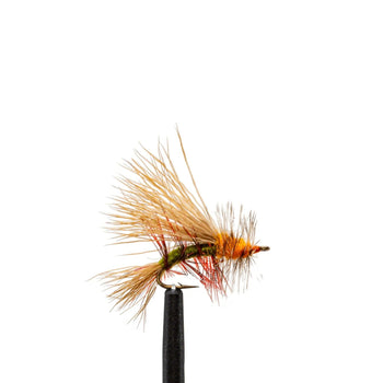- Gold Ribbed Hare's Ear Dry (Sizes 12–16): A unique crossover dry that mimics the rough, mottled appearance of emerging caddis adults. Works well in riffles or fished skittered across the surface.