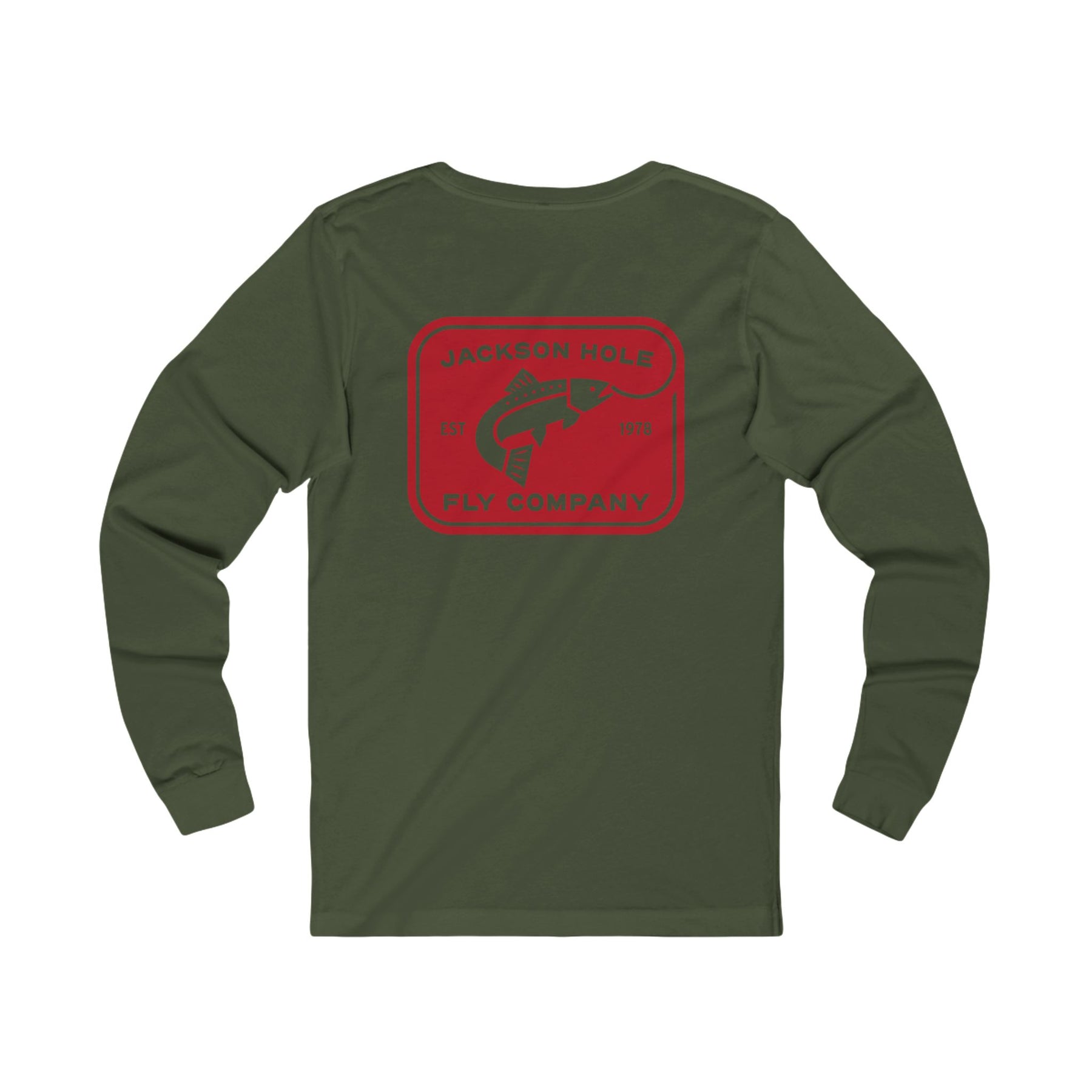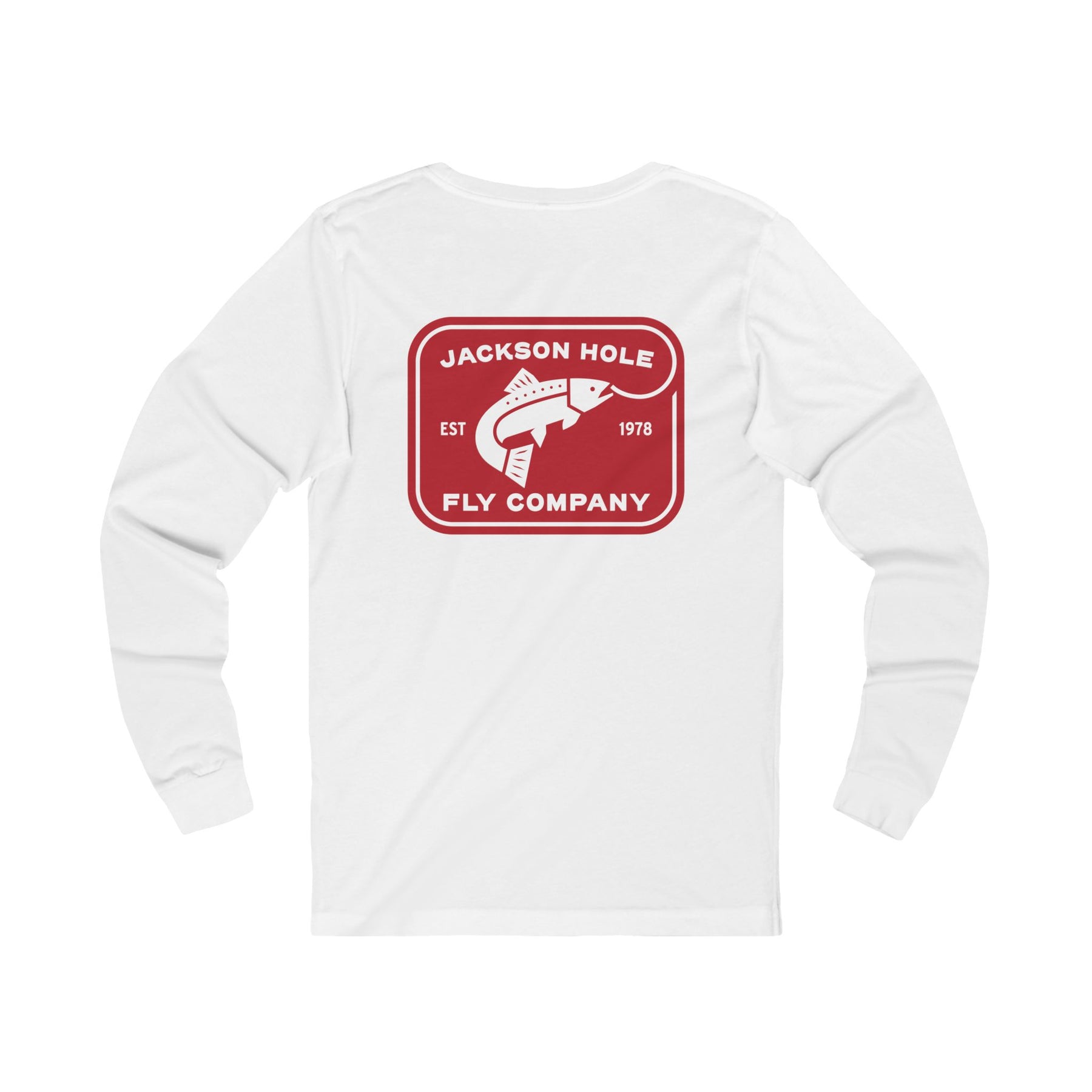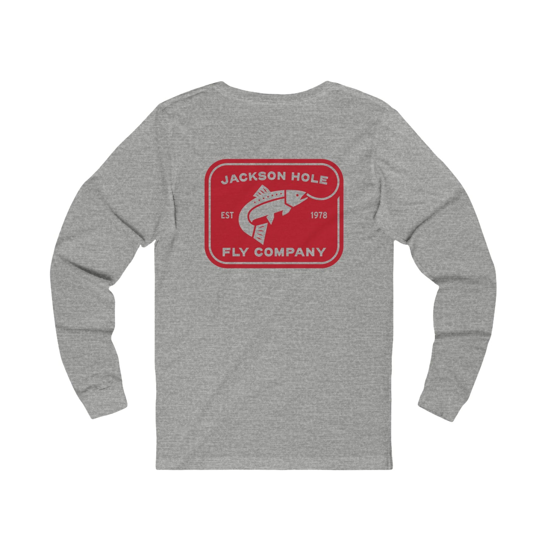 Show off your love for fly fishing with the JHFLYCO Rectangle Badge Long Sleeve Tee. Designed for cool mornings, layering, and year-round wear, this premium long sleeve offers lightweight comfort with timeless outdoor style. Featuring the signature Rectangle Logo on the front chest and a bold full-back design in deep red, it delivers timeless Jackson Hole heritage in a modern silhouette.
