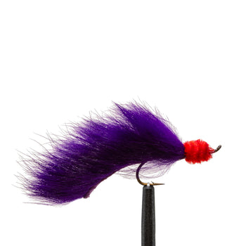 7. Purple Egg-Sucking Bunny – Orange Egg (#4-8): Equal parts leech and attractor, this fly delivers bold color contrast for cold, off-color water. The orange egg head gives trout a clear target, while the purple rabbit strip pulses naturally with every pause. It excels when visibility is low and trout need incentive—swing it through tailouts or slow-strip along seams where fish hold tight to the bottom.