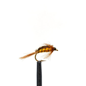 Dropper: Caddis Pupa – Brown or Beadhead Soft Hackle Pheasant Tail (#14–#16) — 18–24 inches below the dry fly on 5X fluorocarbon tippet. The pupa rides just below the film, imitating an ascending caddis that hasn't broken through the surface yet. The soft hackle covers caddis pupa and BWO nymph simultaneously with its versatile profile and natural movement.
